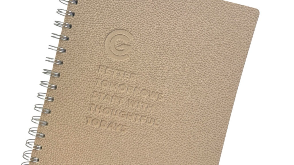 CG Lined Notebook - White and Grey with gold spiral. Front cover has pocket for business cards and notes. Great for client gifts and meeting notes.