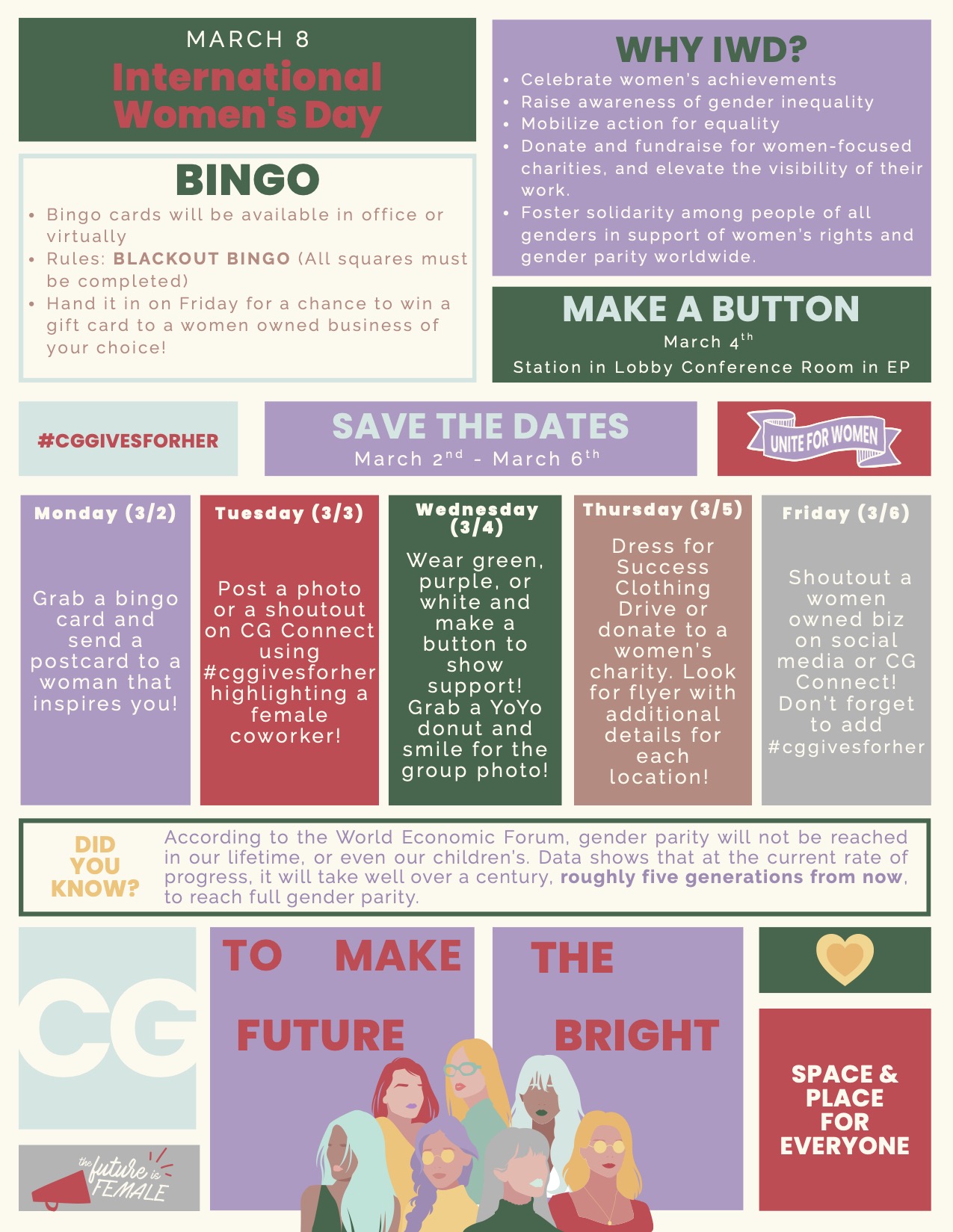 In honor of International Women's Day on March 8th, the CG Women's Network has put together a series of events to celebrate, connect, and inspire — take a look at what we have planned below and get involved!